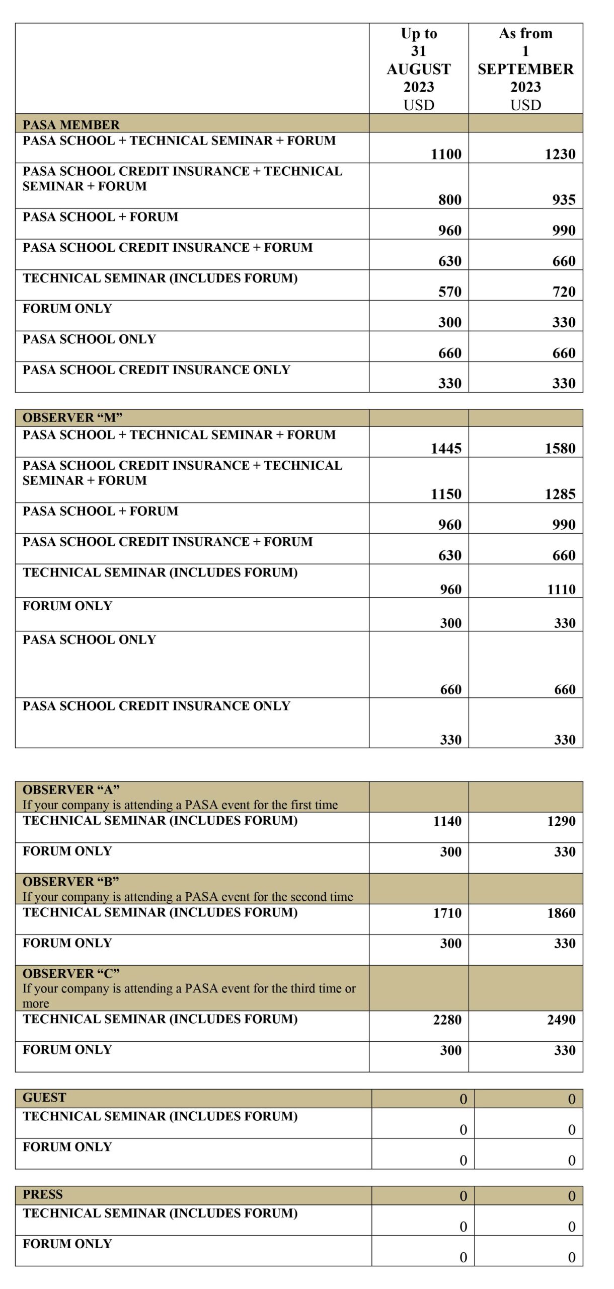 - OBSERVER “A/B/C”: Representatives of a NON MEMBER company. They should be proposed by two member companies of which at least one company must be from the same country in the case of countries that already have PASA members. Proposals should be sent to eventos@apfpasa.ch so that the Operating Office may make inquiries and specifically inform them whether they are authorized to participate. This category does NOT include consultants, reinsurance brokers or intermediaries.